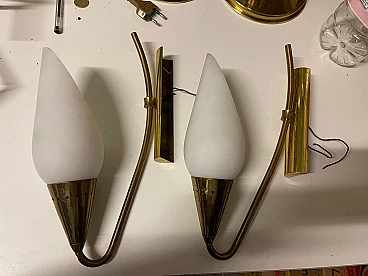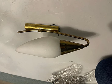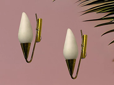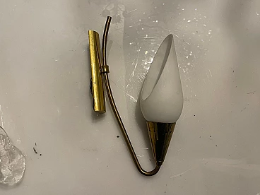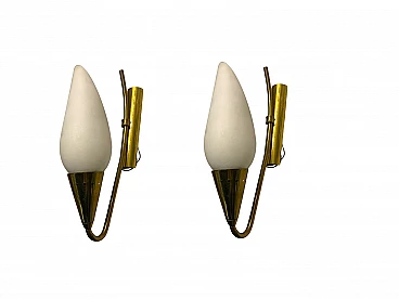 Coppia di applique in metallo dorato e vetro opalino, anni '50