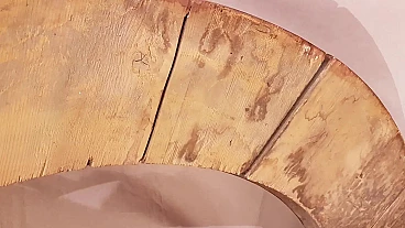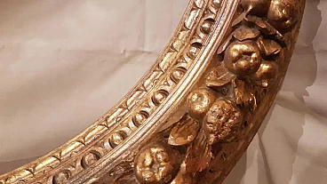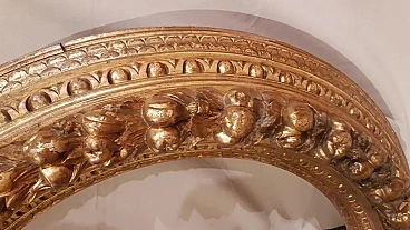 Cornice rotonda intagliata a mano e dorata con foglie d'oro puro proveniente da una "bottega" fiorentina, metà del XIX secolo. Diametro esterno 122 cm, diametro interno 82 cm, spessore 14 cm. In ottime condizioni. Bella cornice rotonda con intaglio del festone centrale con foglie, gemme e frutti in rilievo, foglie stilizzate ricorrenti. Il telaio è in ottime condizioni e presenta solo alcuni segni di usura sulla doratura. Degno di nota è anche la perfetta conservazione della struttura dietro di esso. Questo tipo di cornice, detta anche "Tondo" chiaramente influenzata dai Della Robbia, fu spesso utilizzata nel XVI secolo per incorniciare i più preziosi e importanti dipinti e ritratti provenienti dalle collezioni delle famiglie nobili Fiorentine, oggi esposti nei più importanti musei del mondo. Tanto per citarne uno, il più famoso, il "Tondo Doni" dipinto da Michelangelo e conservato nella Galleria degli Uffizi. L'Italia fu il centro della produzione di cornici durante il Rinascimento e le cornici italiane divennero note per la loro pregevole maestria e bellezza artistica. I primi telai sono stati realizzati per l'uso in un contesto religioso, tabernacolo o per pale d'altare. Le cornici di stampaggio furono introdotte per scopi secolari nel XV secolo e segnarono l'inizio dell'inquadratura come la conosciamo oggi. Il design del telaio Cassetta, o "piccola scatola", composto da un pannello piatto o da un fregio con modanature interne ed esterne rialzate applicate, continuerà ad essere utilizzato nel corso della storia del telaio.