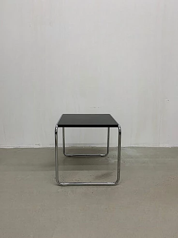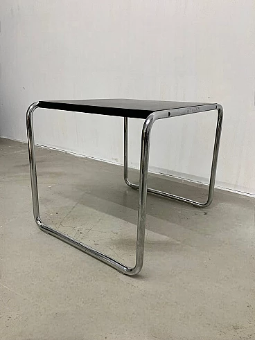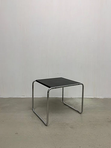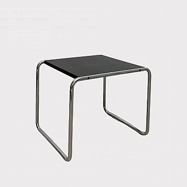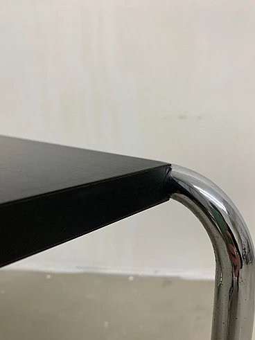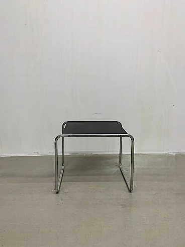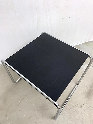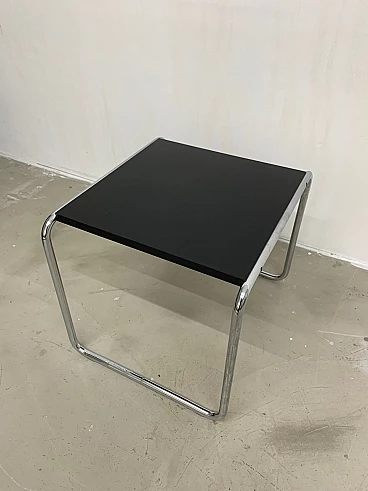 Tavolino Laccio di Marcel Breuer per Knoll, anni '90. Costituto da un piano, due gambe e un tramezzo a incastro. Struttura in acciaio tubolare senza saldatura con finitura cromata lucida, piano con finitura in laminato plastico nero. I tavoli Laccio di Knoll progettati da Marcel Breuer sono fondamentali per la storia del design del '900. L'uso di Breuer dell'acciaio tubolare per definire le linee nello spazio, magnificamente esibito in questa linea di semplici tavolini, ha rivoluzionato la costruzione di mobili e ha ispirato molte generazioni successive di designer.