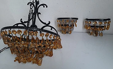 Lampadario e coppia di applique con gocce ambrate, anni '60
