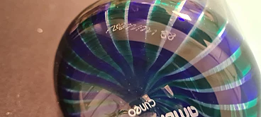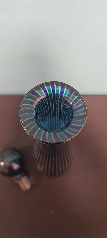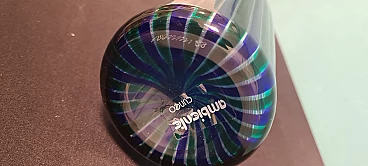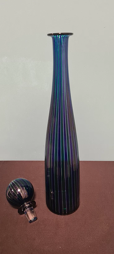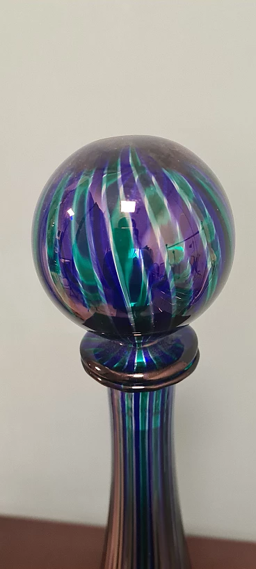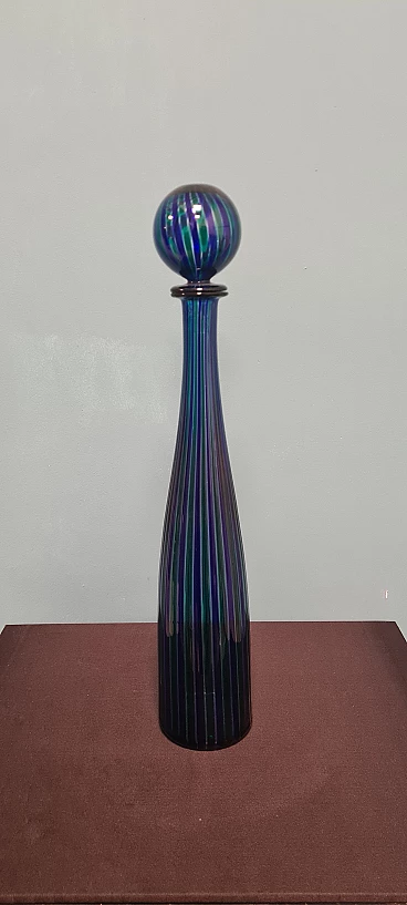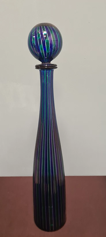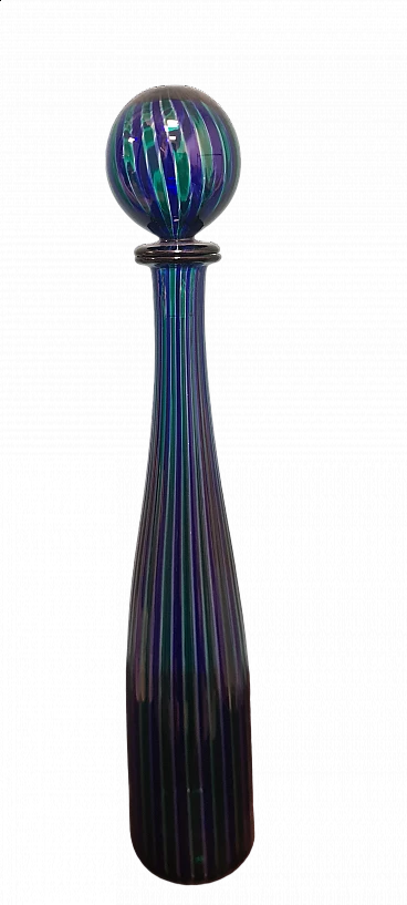 La tecnica usata per la realizzazione di questa bottiglia è quella a "canne", sono infatti alternate "canne" verdi e blu. Perfetta e intatta in ogni sua parte, senza nessun tipo di rottura. Il tappo è originale.