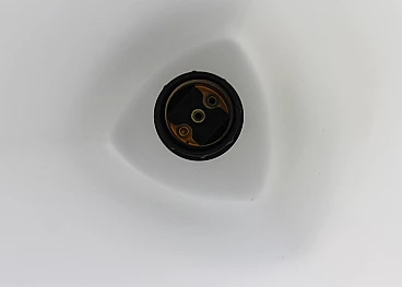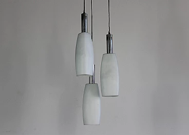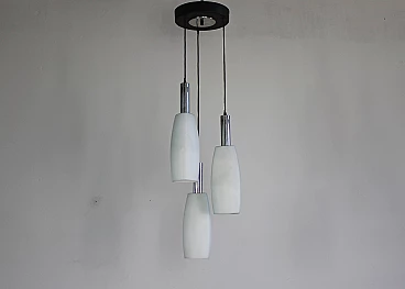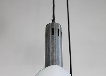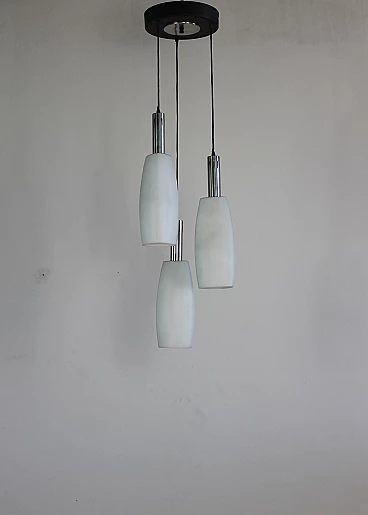 Lampadario o lampada a sospensione a tre elementi in vetro opalino con struttura in metallo smaltato e nichelato. Prodotto da Stilnovo negli anni Settanta. Stilnovo è stata un'importante azienda di illuminazione fondata da Bruno Gatta nel 1946. Stilnovo è una parte significativa della prima ondata di aziende di design italiane del dopoguerra, specializzate nella produzione di illuminazione innovativa e funzionale. Nel periodo di massima produttività, tra il 1950 e la fine degli anni '80, Stilnovo ha collaborato con alcuni dei più importanti designer italiani dopo Bruno Gatta, Danilo e Corrado Aroldi, Gaetano Sciolari, Alberto Fraser, Joe Colombo ed Ettore Sottsass. In un'epoca in cui l'idea di funzione si combinava con nuovi tipi di materiali per produrre forme spartane e nuove, fu un'epoca di sperimentazione, in cui il movimento del neorealismo si scontrava con la filosofia dell'organicismo e in cui gli architetti prendevano in prestito, sovvertivano e scartavano l'arte artigianale che per secoli era stata la forza creativa dominante in Italia. Spesso paragonato con favore ad Arteluce, che sotto la guida di Gino Sarfatti esplorò forme astratte e lineari, lo Stilnovo è noto per le sue linee organiche ben eseguite. La lampada da tavolo Periscope, progettata da Aroldi nel 1967, ne è un esempio. Esposta al New Domestic Landscape di New York nel 1968, le sue linee serpentiformi sono mitigate dalla finitura a smalto, creando un effetto allo stesso tempo sobrio e vivo.