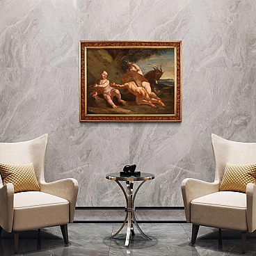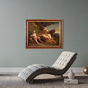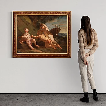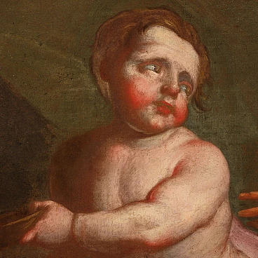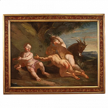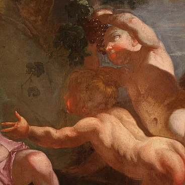 Dipinto a olio su tela di scuola napoletana raffigurante un Baccanale di putti, '600. Notevole la qualità dell'incarnato che grazie all'utilizzo del chiaroscuro dona volumetria e plasticità ai personaggi (vedi foto). Il putto sulla sinistra si defila con la ciotola contenente del vino, quello centrale si protrae verso di lui mentre quello più a destra è ritratto nel gesto di cogliere un grappolo d'uva accanto a un caprone.