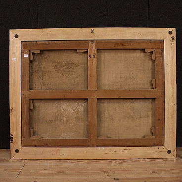 È adornato da una cornice lignea moderna laccata, dorata e dipinta con decori floreali. Misure senza cornice: 85 x 115 cm.