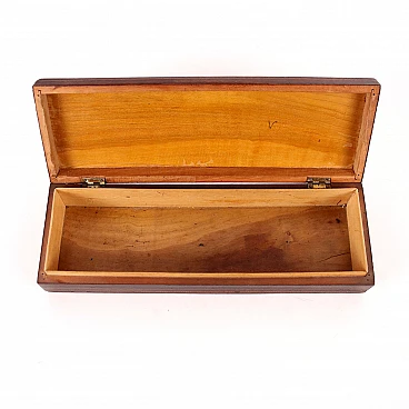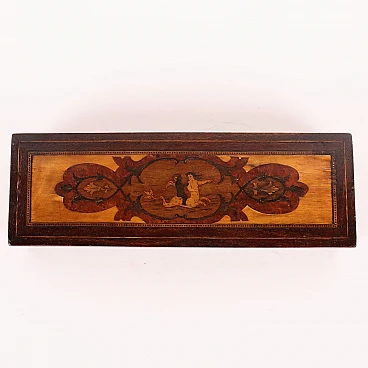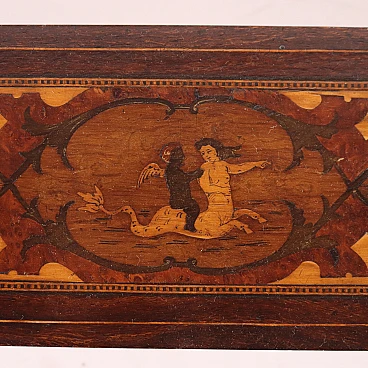 Scatola in legno con coperchio intarsiato con figure mitologiche, inizio '900