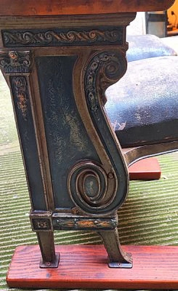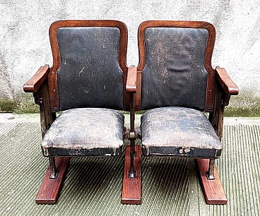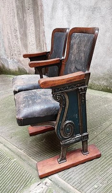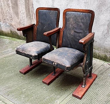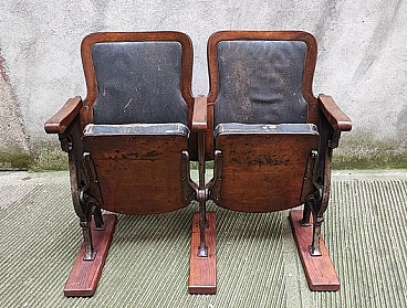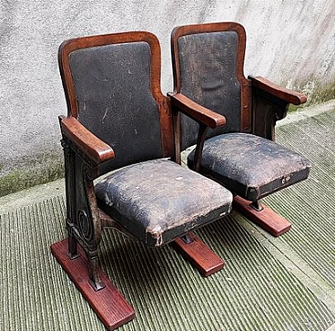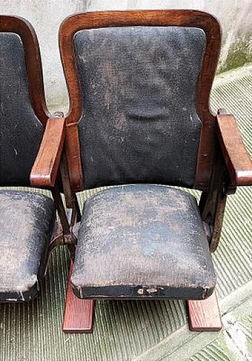 Fila di coppia di poltrone da teatro con struttura in legno e ghisa, anni '30