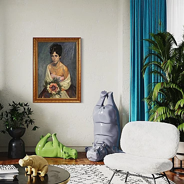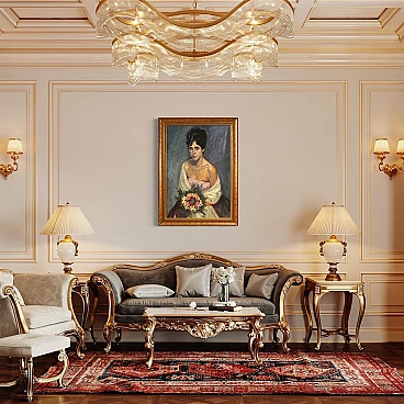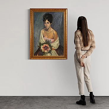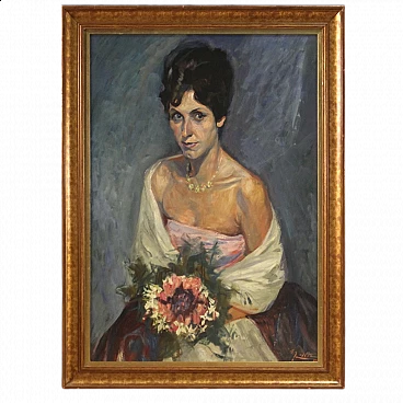 Ritratto femminile con bouquet, dipinto a tecnica mista su cartoncino