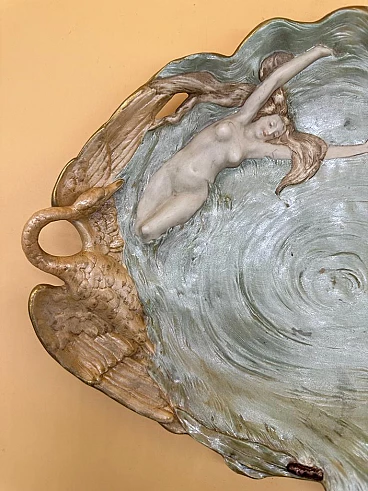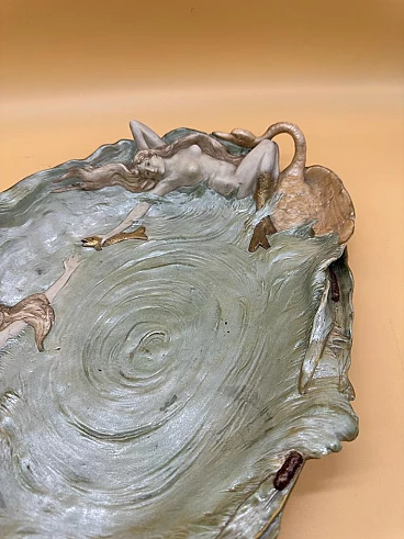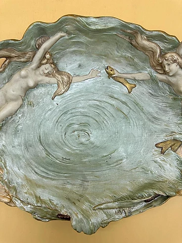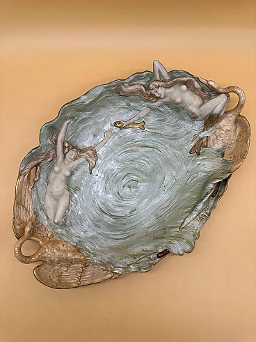 Bassorilievo in ceramica ovale con due sirene, pesci e due manici a cigno, inizio '900
