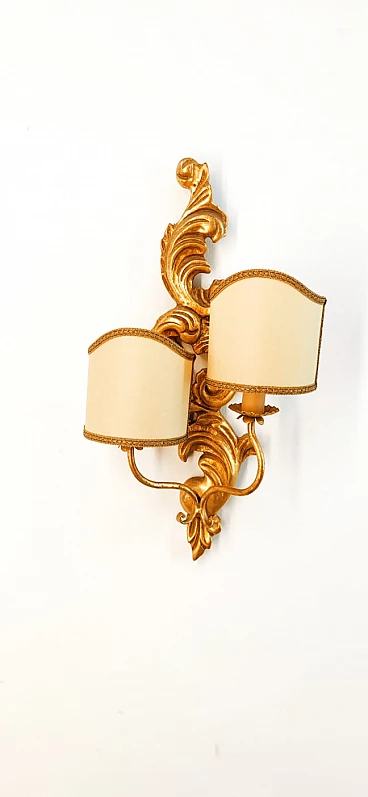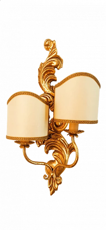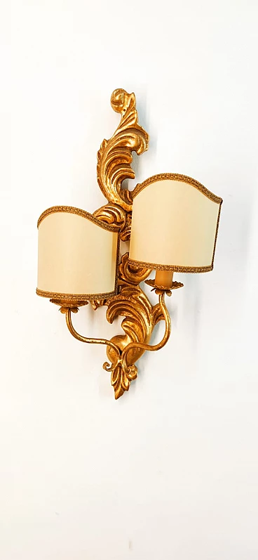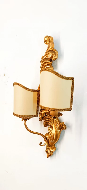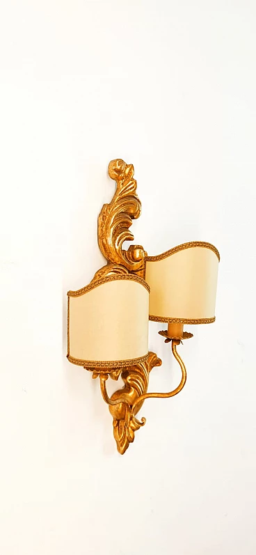 Applique singola in legno foglia oro con paralumi in pergamena, tardo '900