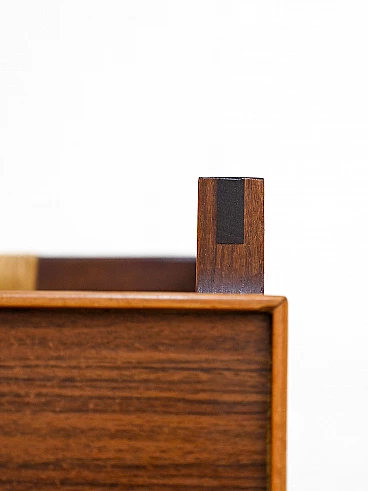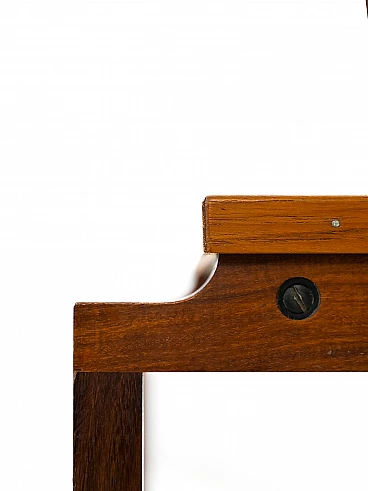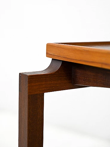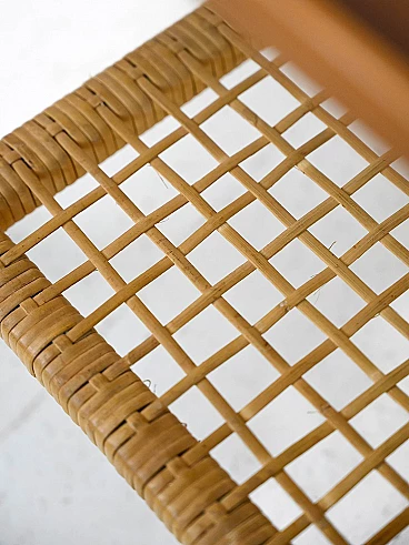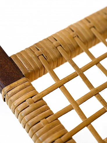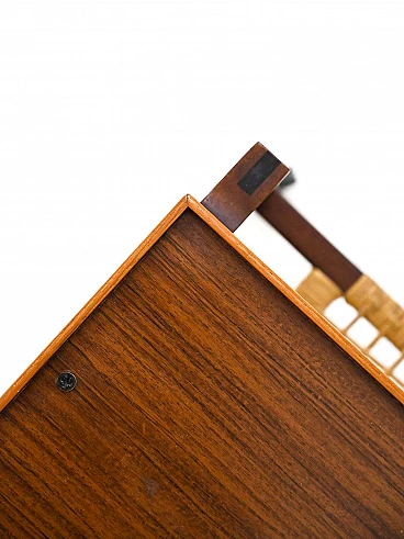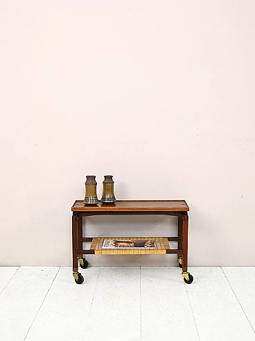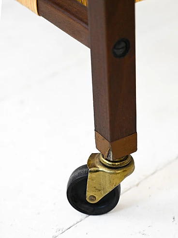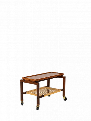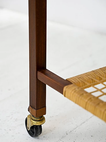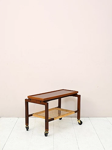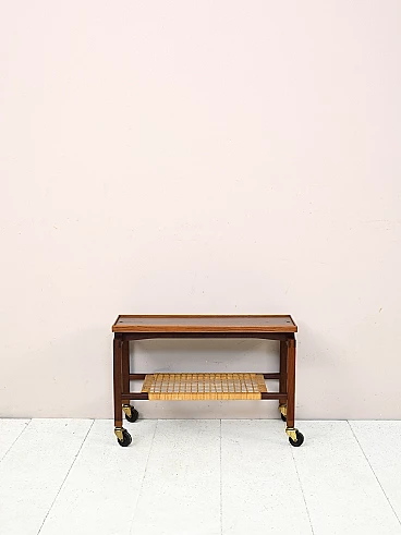 Carrello bar scandinavo, anni '60-'70. Struttura in legno e ripiano inferiore in rattan intrecciato. Può essere usato come carrello multiuso o come tavolino. È stato fatto un restauro conservativo; potrebbe presentare segni del tempo.