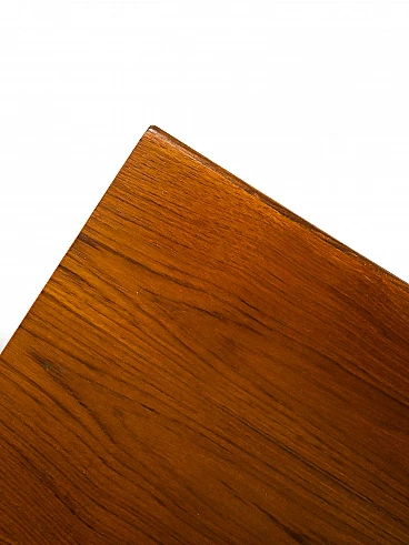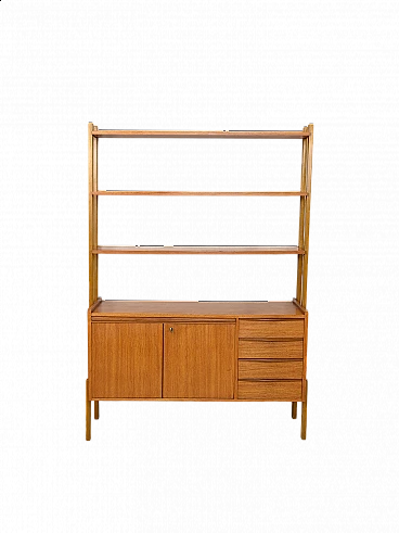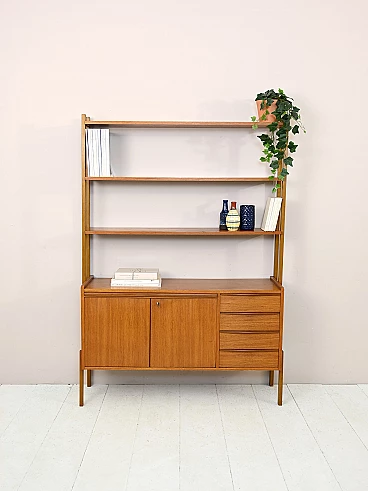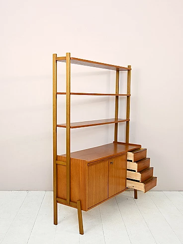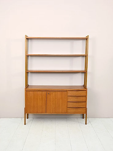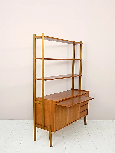 Mobile libreria in teak di modernariato svedese. La parte bassa è un piccolo sideboard dotato di 4 cassetti e di un vano contenitore con ante scorrevoli e serratura. Il piano estraibile permette di trasformarlo all’occorrenza in un piccolo scrittoio per lo smart working. La parte alta è un sistema di scaffalature ad altezza regolabile. Ideale per ricreare un angolo studio in una stanza di piccole dimensioni o in camera da letto. Buone condizioni. E’ stato fatto un restauro conservativo. Potrebbe presentare dei segni del tempo.