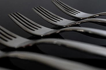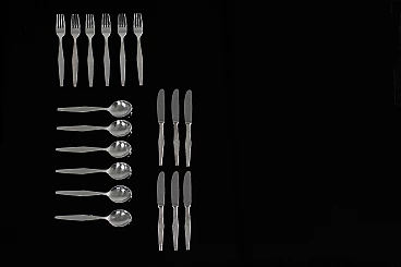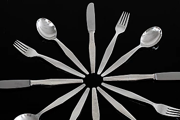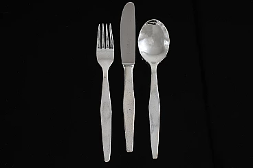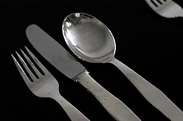 Servizio di posate in alpacca di Gio Ponti per Arthur Krupp, anni '50. Costituito da sei cucchiai, sei forchette e sei coltelli con lama in acciaio.