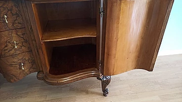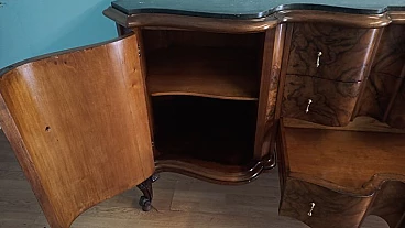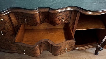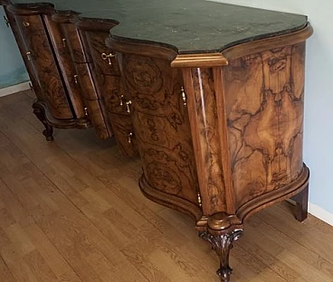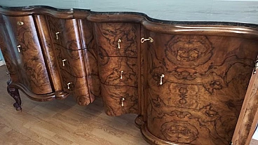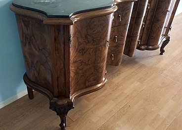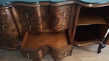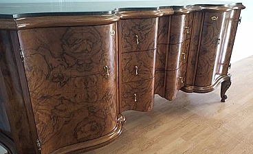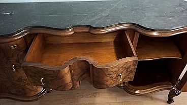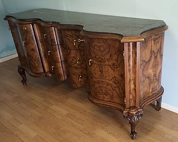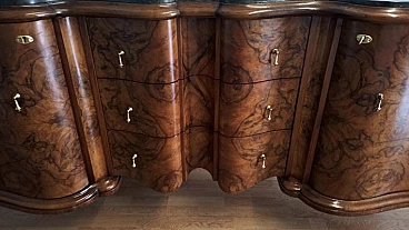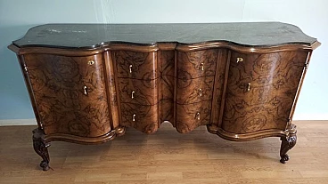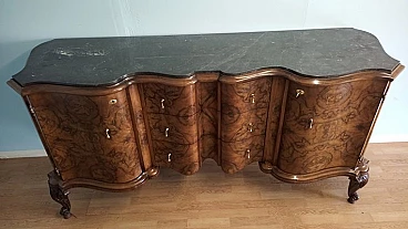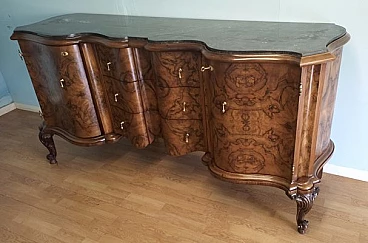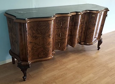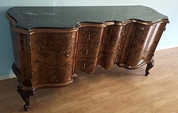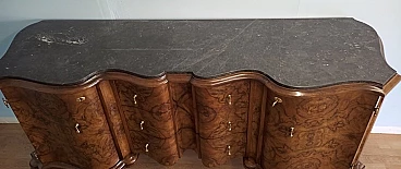 Credenza stile Chippendale realizzata tra gli anni '20 e '40. Struttura impiallacciata in radica di noce e piano in marmo nero che contrasta magnificamente con il resto del mobile.