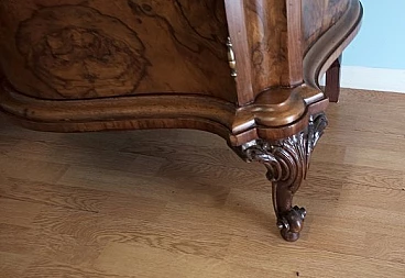 Il fronte è mosso ed è costituito da due ante laterali bombate e da tre cassetti centrali anch'essi bombati. Le due ante sono dotate di serratura funzionante con chiave e bocchetta in bronzo. I montanti laterali sono tagliati e scolpiti. Lo stesso tipo di legno è stato utilizzato per realizzare i fianchi. La parte inferiore del fronte è sottolineata da un elemento che forma uno zoccolo. Il mobile poggia su quattro alte gambe ad arco, scolpite con foglie d'acanto nella parte superiore e con una zampa di elefante alla base. Gli interni sono rivestiti in noce come il resto della struttura.