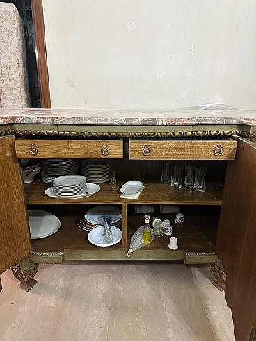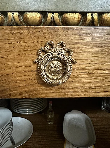 da piastrelle decorate con motivi di putti e di fiori, nascondono due ampi ripiani interni e due cassetti. Il design della credenza trae ispirazione dal modello dal celebre cassettone "La Commode Commandée” realizzato da Jean-Henri Riesener (1734-1806) nel 1775 per le stanze private del re Luigi XVI a Versailles e oggi nelle collezioni del Musée Condé del Castello di Chantilly. L’autore, sconosciuto, ha rielaborato questo modello tipico dello stile Luigi XVI aggiungendo elementi decorativi diversi e una decorazione in stile veneziano con laccatura barocchetto.