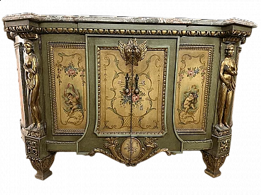 Bel mobile credenza con piano sagomato in marmo e corpo in legno intagliato, laccato e dipinto in stile veneziano, completo di doppio cartiglio dorato centrale, su piedi scolpiti e dorati. Le due ante frontali, fiancheggiate da figure allegoriche in legno dorato e scolpito, e