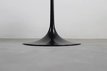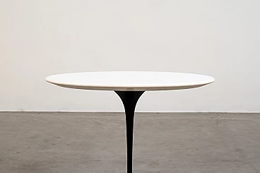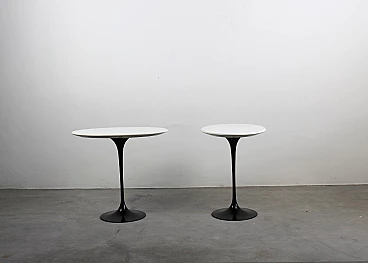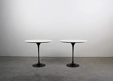 Coppia di tavolini con base a piedistallo nera in alluminio pressofuso verniciato e piano ovale in legno laccato bianco. Questi due tavolini sono stati prodotti negli anni '90 nello stile del designer Eero Saarinen.