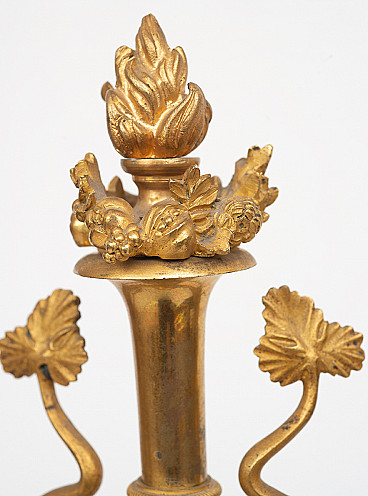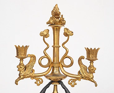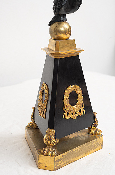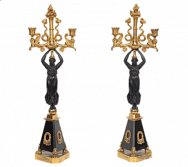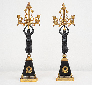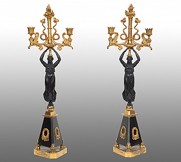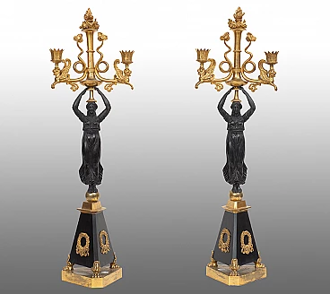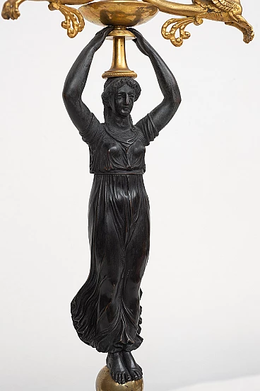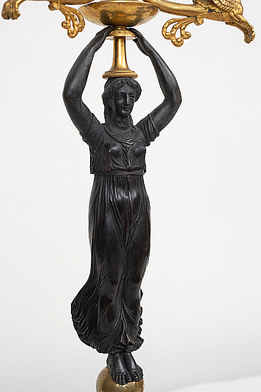 Coppia di candelabri Direttorio in bronzo brunito con figura di donna, inizio '800