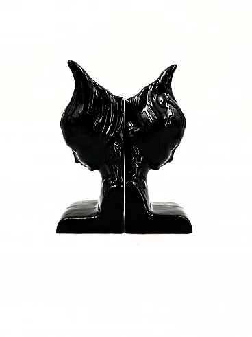 Coppia di fermalibri Art Déco in ceramica smaltata nero di Angelo Minghetti, anni '20