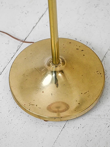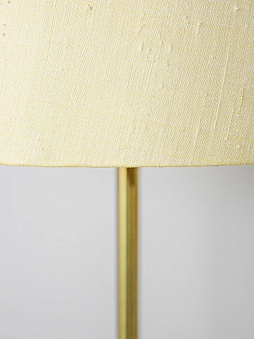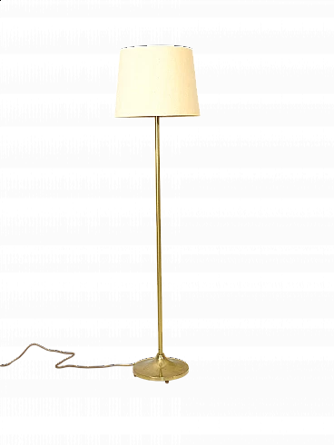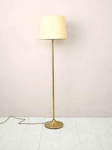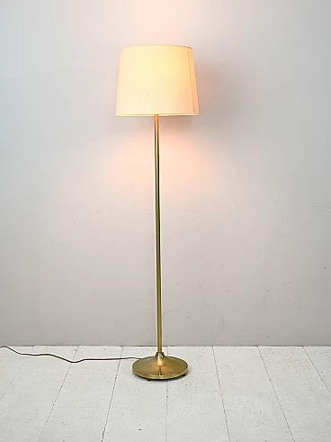 Lampada da terra scandinava con struttura in metallo dorato e paralume in tessuto, anni '60