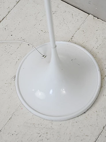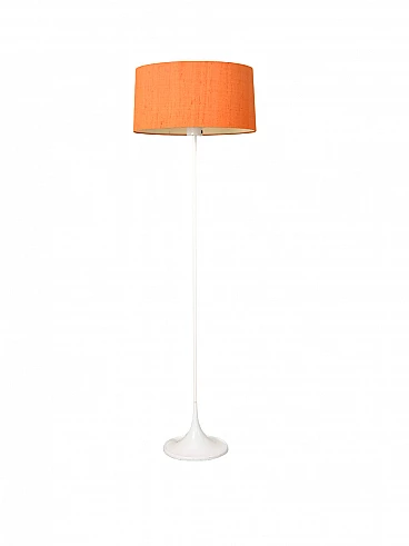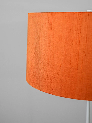 Lampada da terra scandinava, anni '60. Struttura in plastica bianca e paralume in tessuto arancione. Si distingue per il lungo e sottile stelo e per l'ampio paralume colorato. In buone condizioni; potrebbe presentare segni del tempo. Impianto elettrico originale: si consiglia la sostituzione per un corretto utilizzo.
