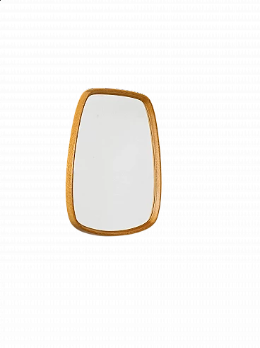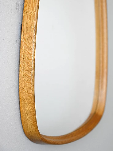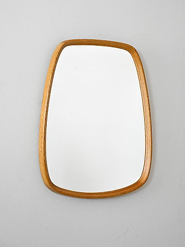 Specchio da parete scandinavo con cornice in rovere chiaro, anni '60. Si distingue per la forma dai bordi morbidi e dagli angoli smussati. La cornice è sottile e sporge leggermente rispetto allo specchio. In buone condizioni; potrebbe presentare segni del tempo.