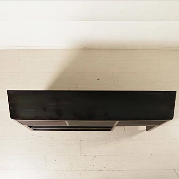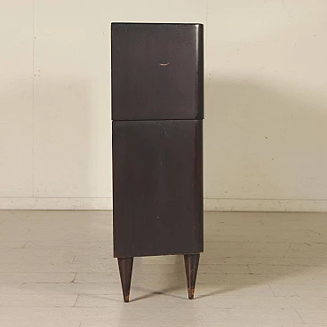 Cassettiera con vano a giorno da negozio, proveniente da una bigiotteria del centro di Milano, probabile attribuzione ad Osvaldo Borsani; legno impiallacciato ebanizzato con finitura in poliestere. Prodotto in buone condizioni, presenta piccoli segni di usura.