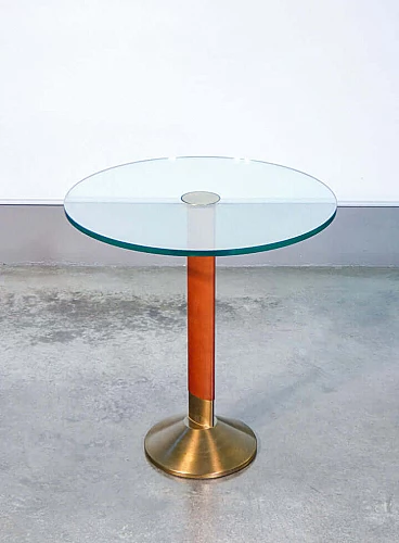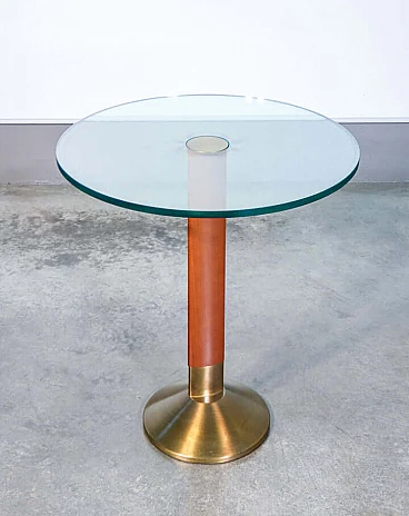 Tavolino rotondo di Daniela Puppa per Fontana Arte, anni '80. Piano in cristallo, sostegno in legno e base in ottone.
