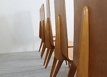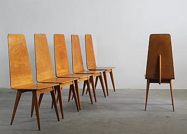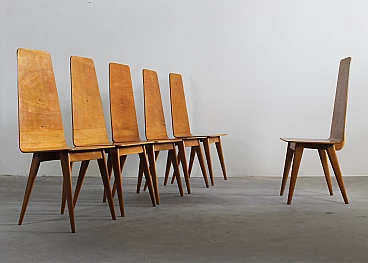 Rarissimo set di sei sedie da pranzo interamente in legno curvato, progettato dall'artista italiano Sineo Gemignani e prodotto in Italia negli anni Quaranta. L'artista nasce a Livorno il 30 luglio 1917, ma intorno ai primi anni Venti la famiglia è costretta a tornare nei luoghi di origine del padre (San Pantaleo presso Vinci) a causa della sua attività politica che aveva attirato l'attenzione dei fascisti. Qui il piccolo Sineo viene indirizzato allo studio dell'arte dal suo maestro Virgilio Gandi. La famiglia si trasferisce poi a Empoli, dove Sineo trascorre il resto della sua vita e muore prematuramente il 22 maggio 1973.