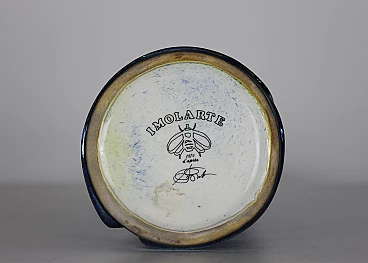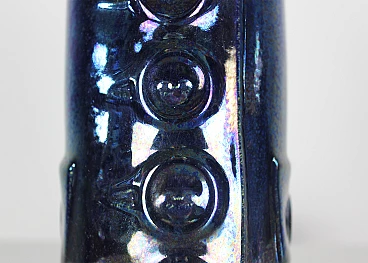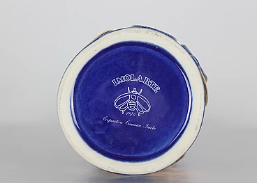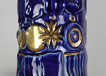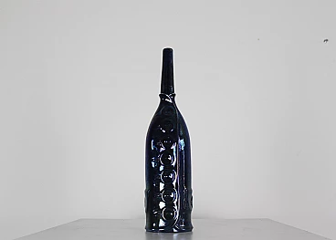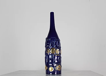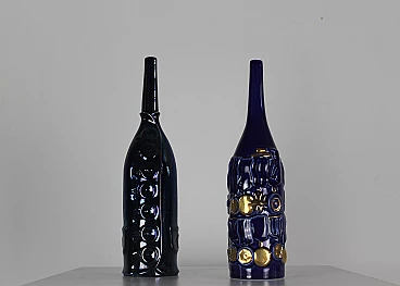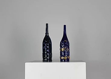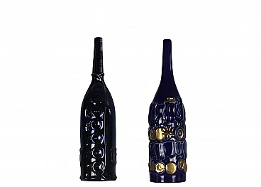 Coppia di bottiglie della serie Bottiglie Abitate di Gio Ponti per Cooperativa Ceramica d'Imola, progettate negli anni '50 e prodotte negli anni '90. In ceramica blu con decorazioni dorate realizzate dalla Bottega Gatti di Faenza. Marchio della manifattura e firma sotto la base. La più grande è alta 36 cm, l'altra 30 cm.