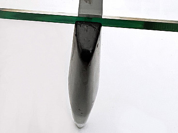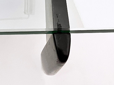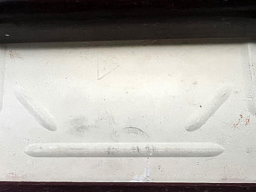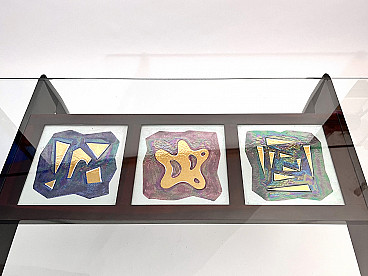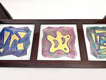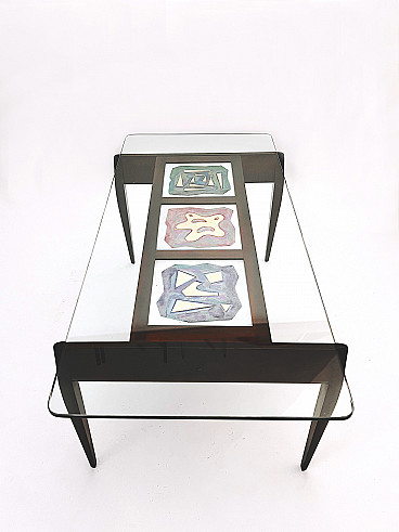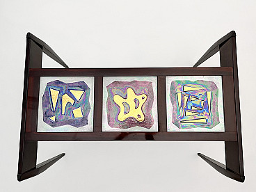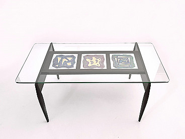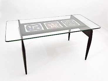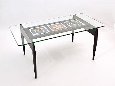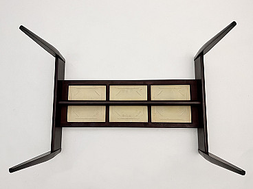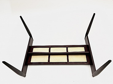 Tavolo in legno tinto con formelle di ceramica e piano in vetro, anni ’50