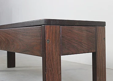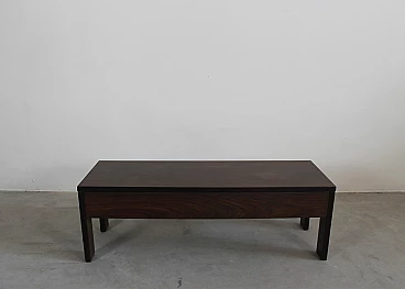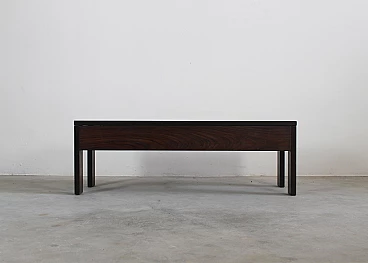 Un tavolino rettangolare o tavolino da divano interamente realizzato in legno, disegnato da Ettore Sottsass per Poltronova, Agliana anni '60. Figlio di un architetto, Ettore Sottsass jr. (1917-2007) è nato a Innsbruck, ha studiato a Torino e si è laureato al Politecnico della città nel 1939 prima di iniziare a lavorare con il padre nel 1945. Dopo aver aperto il proprio studio a Milano ha si interessa al design industriale e all'interior design. Il suo lavoro con la ceramica e l'oreficeria è noto per la sua forza espressiva e per lo studio e l'analisi personale del colore (aspetto che è ancora una costante in tutto il suo lavoro). Andando oltre il movimento razionalista del suo tempo, Sottsass ha forgiato la propria strada nel design, creando oggetti molto diversi tra loro e con una forte componente emotiva. I suoi progetti per la Triennale di Milano e, soprattutto, con Olivetti (a partire dal 1957), per cui disegna celebri macchine da scrivere come la Praxis 48, la Lettera 36 e la Valentine, sono passati alla storia del design. Sempre per Olivetti, Sottsass disegna Elea 9003, il primo computer italiano, che gli vale un Compasso d'Oro nel 1959 (ne vinse un secondo nel 1970 per Valentine). La sua profonda ricerca formale, la continua attenzione alle nuove avanguardie, la sperimentazione e l'arte concettuale hanno reso Sottsass un esponente di spicco e una fonte di ispirazione per numerose correnti del design degli anni '60 in Italia e in Europa. Ha creato mobili sperimentali (tra cui alcuni pezzi unici) e ha partecipato alla famosa mostra del 1972 sull'habitat domestico del futuro al MoMA di New York intitolata Italy. Il nuovo paesaggio domestico. Nei primi anni '80 fonda il gruppo Memphis, che si occupa di produzione di oggetti e mobili, e il proprio studio, Sottsass Associati, che si occupa di architettura oltre che di design. Le sue collaborazioni e amicizie con artisti e critici sono state molto importanti per la carriera di Sottsass. Dagli anni '90 in poi si è concentrato sull'architettura, principalmente case e urbanistica. Nel corso della sua lunga carriera Sotsass ha ricevuto numerosi premi e riconoscimenti, tra cui il titolo di Chevalier de l'ordre des arts et des lettres in Francia (1992) e lauree honoris causa presso la Rhode Island School of Design negli USA (1993) e al Royal College of Art di Londra (1996).