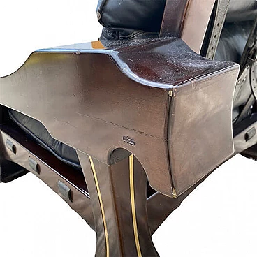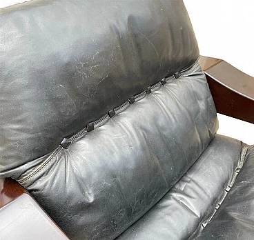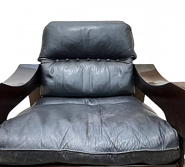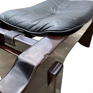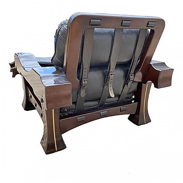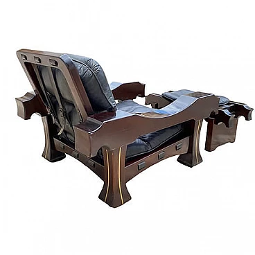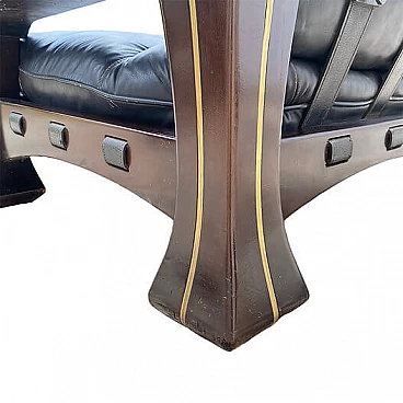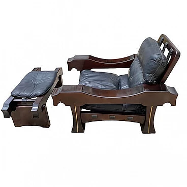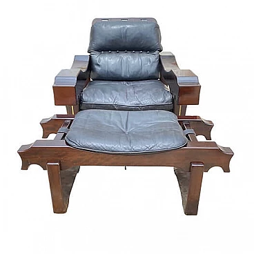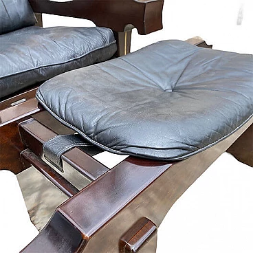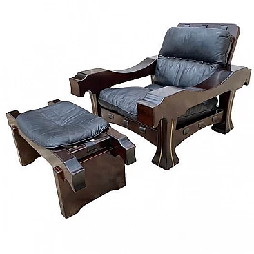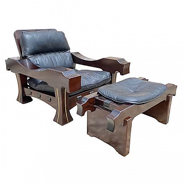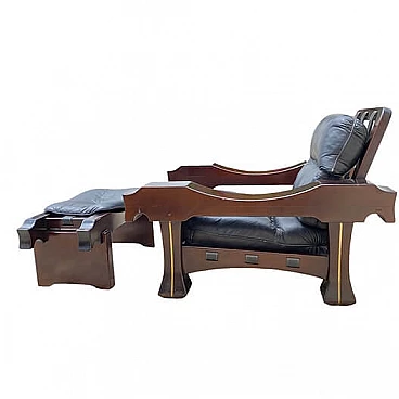 Poltrona e poggiapiedi Ussaro in legno, ottone e pelle di Luciano Frigerio, anni '70