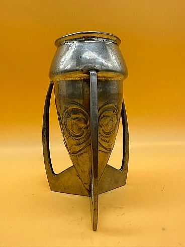 Vaso in metallo argentato a tre anse con foglie stilizzate