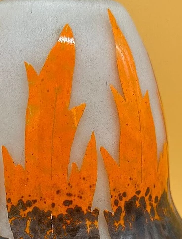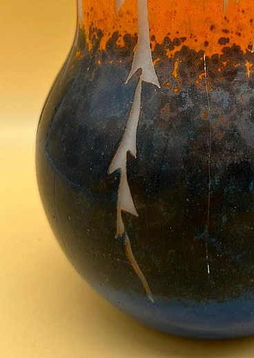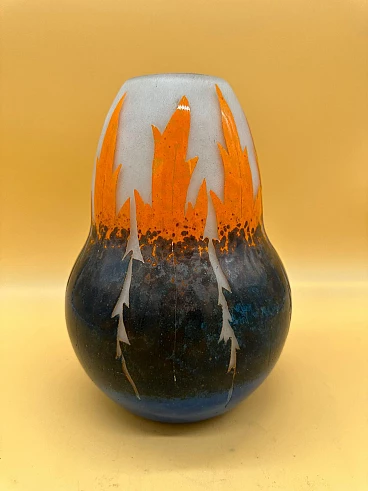 Vaso Art Deco in vetro con foglie stilizzate blu e arancio, inizio '900