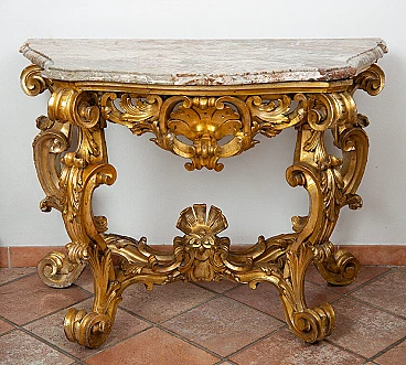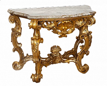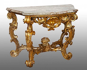 Consolle Luigi XV in legno intagliato e dorato con piano sagomato in marmo, realizzata a Roma nel '700. L'intaglio è un trionfo di cartocci fogliacei, fiori e foglie, mentre una conchiglia fogliacea funge da "chiave" di raccordo sulla fronte. Una più grande conchiglia alternata a racemi va ad impreziosire la fascia sottopiano. I piedi sono sapientemente intagliati e terminano con ricciolo estroflesso. Completa di certificato di autenticità.