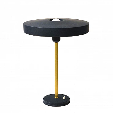 Lampada da tavolo Timor 69 progettata da Louis Kalff per Philips Lighting negli anni '50, con stelo in ottone e base e paralume in alluminio verniciato verde scuro. In ottime condizioni, le parti in alluminio sono state restaurate.