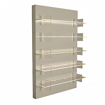 Libreria a parete parte di un arredo su misura. Struttura in laminato, ripiani in plexiglas con illuminazione. Prodotto in buone condizioni, presenta piccoli segni di usura.