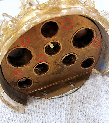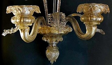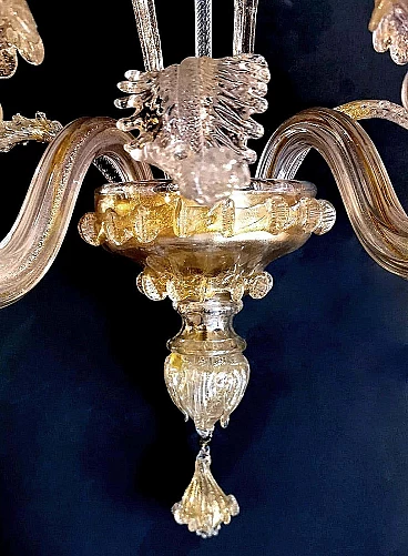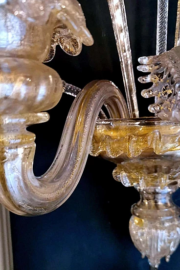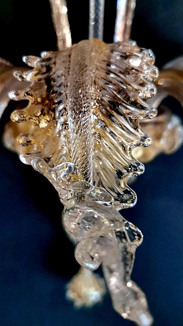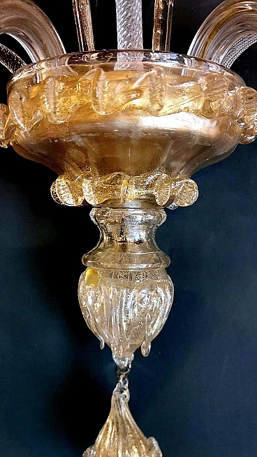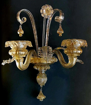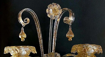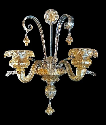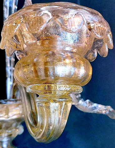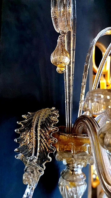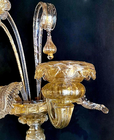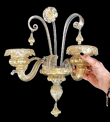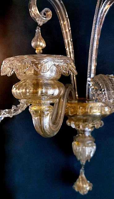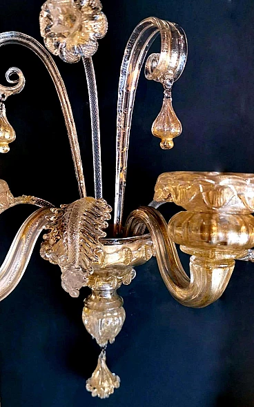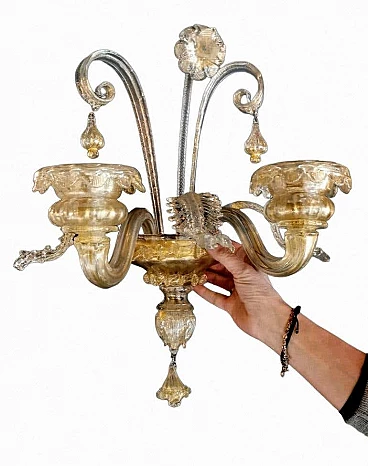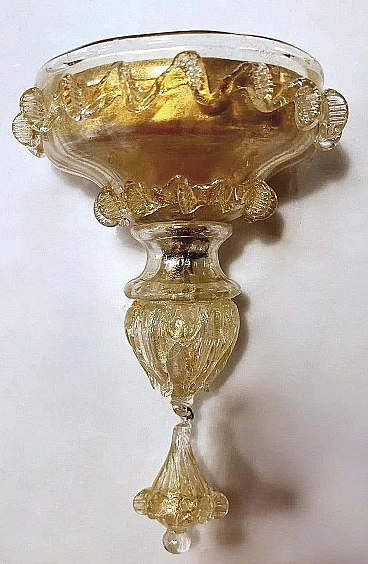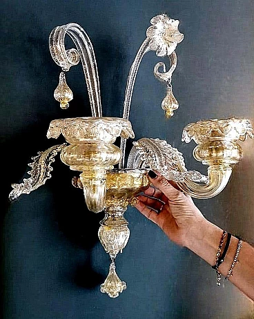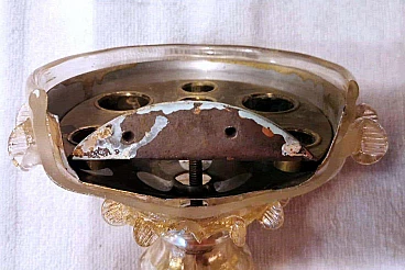 Preziosa applique in vetro di Murano realizzata in un grazioso stile Art Nouveau. Si tratta di un'autentica lampada da parete classica veneziana lavorata secondo la rinomata tecnica del vetro di Murano. Ogni singolo pezzo è stato soffiato a bocca dal Maestro vetraio, poi rifinito a mano dando forma e leggerezza con eccezionale maestria. I pezzi sono stati assemblati con maestria e l'insieme ha assunto una forma morbida e armoniosa, elegante e raffinata. La nostra applique si distingue anche per la raffinata decorazione in oro 24 carati; quando si intende arricchire il vetro con la foglia d'oro, il Maestro vetraio rende l'oro parte integrante della miscela ponendo una lamina sulla parte di miscela raccolta dal crogiolo, quindi ricopre il tutto con un ulteriore strato vetroso. A questo punto, il vetraio provvede all'operazione di soffiatura attraverso la quale l'oro si disperde nella miscela, dando luogo a un effetto polvere d'oro. Con questo sistema si crea una polvere brillante all'interno del vetro stesso che impreziosisce in modo discreto l'oggetto da creare. I due portalampada hanno le luci rivolte verso l'alto e questo permette di diffondere la luce in tutta la stanza, inoltre la finitura in cristallo e oro crea magici e fantastici giochi e riflessi di luce. La nostra applique è una piccola opera d'arte realizzata tra il 1950 e il 1955 con magica maestria e impareggiabile abilità da un grande maestro artigiano in un luogo magico, affascinante e artistico: una fornace artigianale di Murano. La realizzazione di questo oggetto ci conferma che l'attitudine veneziana, celebrata nei secoli, alla lavorazione del vetro, è una combinazione alchemica di materia liquida elaborata dall'intelligenza artigiana con felici intuizioni artistiche e rappresenta un'alta espressione dell'artigianalità e della manualità dei Maestri vetrai, un'opera d'arte unica e raffinata caratterizzata da una complessa lavorazione eseguita a mano che sicuramente affascina e stupisce. Nella parte centrale da cui si dipartono i due bracci e le altre decorazioni, è presente una placca in ottone con diversi fori numerati, che stanno a indicare il corretto posizionamento dei vari pezzi (vedi foto). L'applique è in buone condizioni L'impianto elettrico è funzionante ma il cablaggio è europeo, la compatibilità di tensione in altri stati va sempre verificata da un elettricista prima dell'uso. Misure larghezza 40 cm, profondità 25 cm, altezza 50 cm. Per tutte le nostre spedizioni utilizziamo materiali di imballaggio speciali (casse di legno su misura, polistirolo, ecc.) per la massima protezione e sicurezza degli articoli.