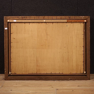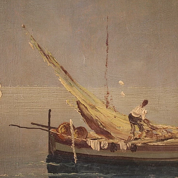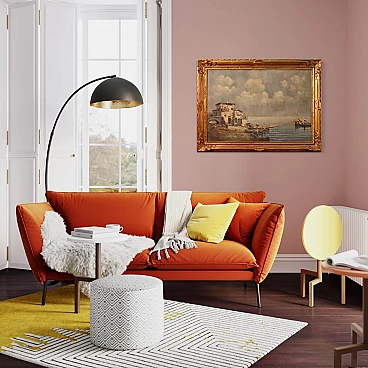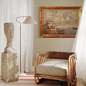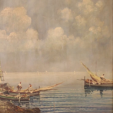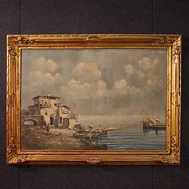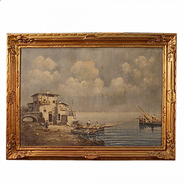 Dipinto italiano della prima metà del XX secolo. Opera olio su tavoletta raffigurante marina, veduta con barche e pescatori, di buona mano pittorica. Quadro di grande misura e impatto adornato da cornice lignea scolpita e dorata (tinta bronzo). Tavoletta firmata in basso sinistra E. Percivaldi (vedi foto) riferibile al pittore Ettore Percivaldi, mancante di autentica. Quadro di buona luminosità e piacevole prospettiva, in bella patina. Tavoletta che presenta qualche segno del tempo (vedi foto), nel complesso in discreto stato conservativo. Luce dipinto H 68 x L 98 cm.