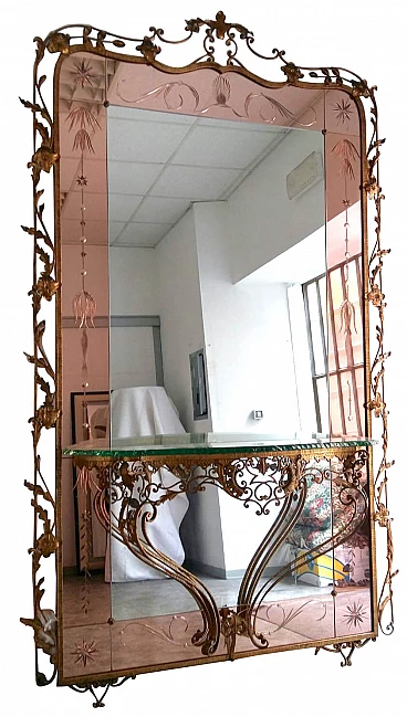 Grande specchiera anni 50, struttura della cornice in ferro dorato lavorato, specchio centrale con bordo specchiato color rosa con figure incise, consolle in ferro dorato con piano in vetro