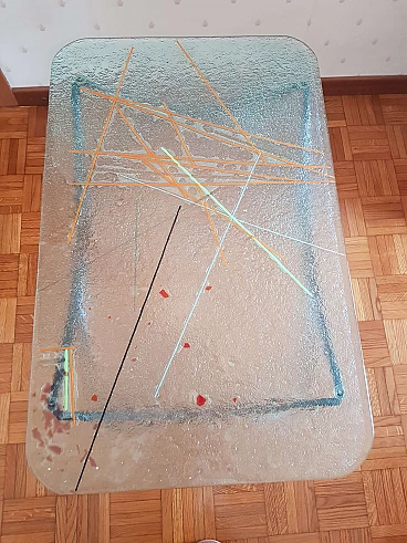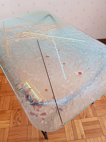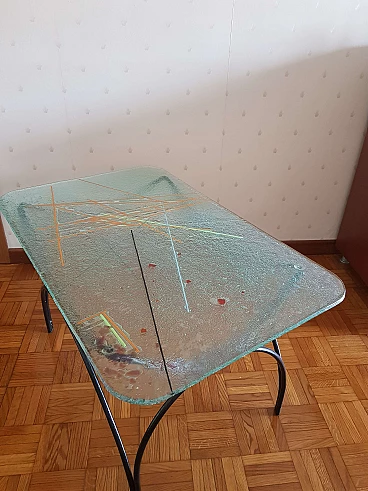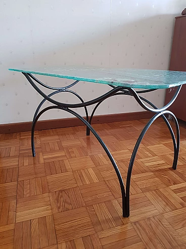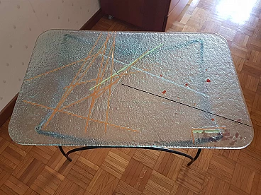 Tavolino in ferro battuto con piano in vetro dipinto di Pietro Arnoldi, anni '80