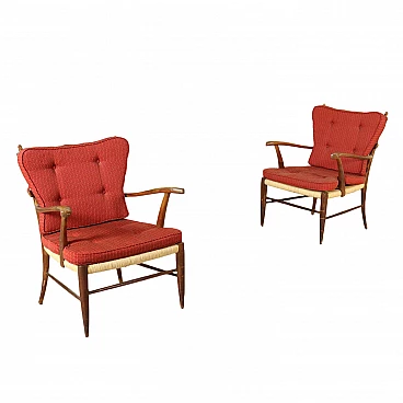 Coppia di poltrone nello stile di Paolo Buffa; struttura in legno di rovere, seduta in rafia, cuscini in espanso e rivestimento in tessuto. Prodotto in buone condizioni, presenta piccoli segni di usura. Altezza seduta (cm): 35