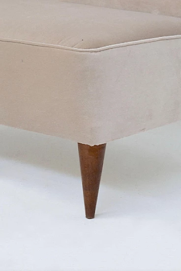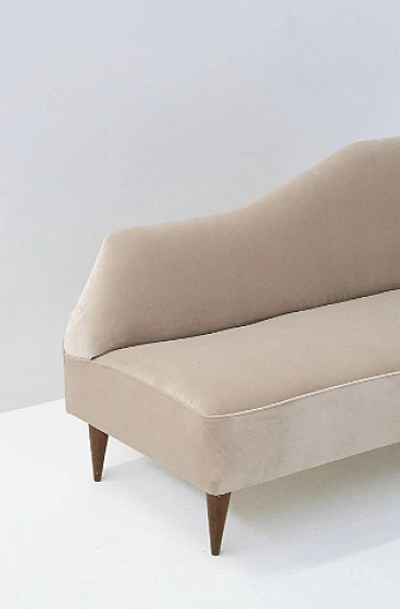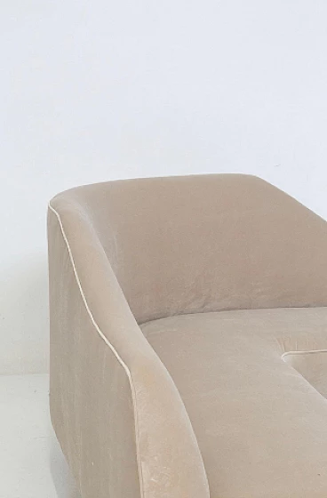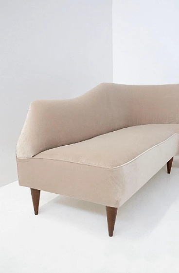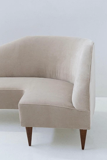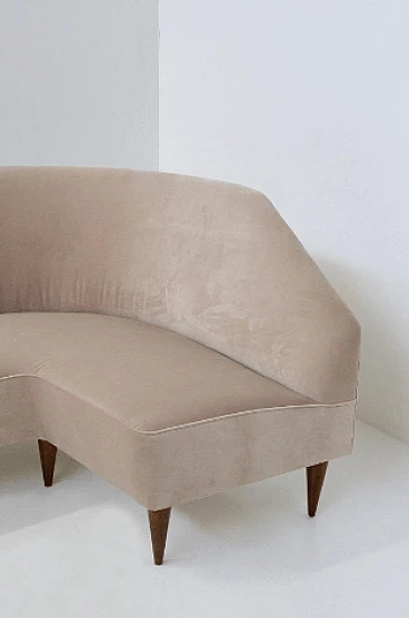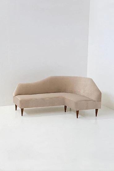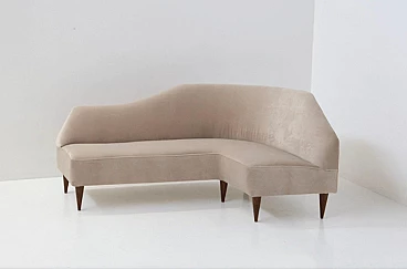 Divano angolare asimmetrico in velluto beige attribuito a Gio Ponti, primi anni '50.