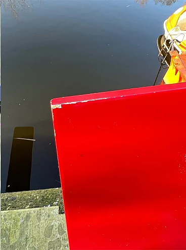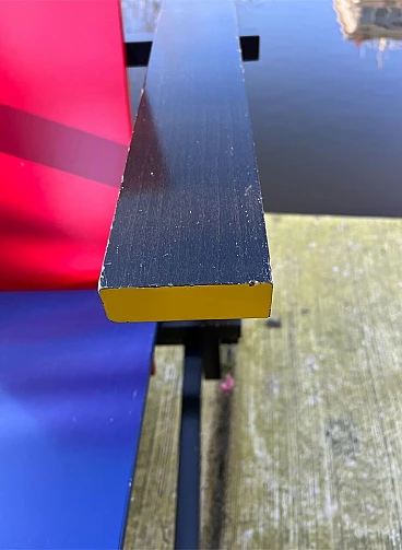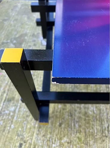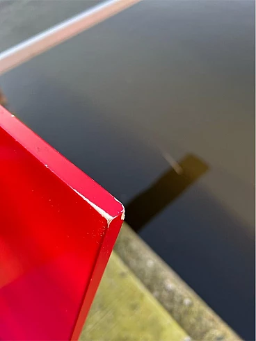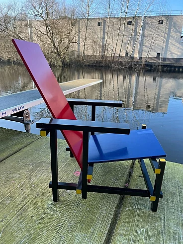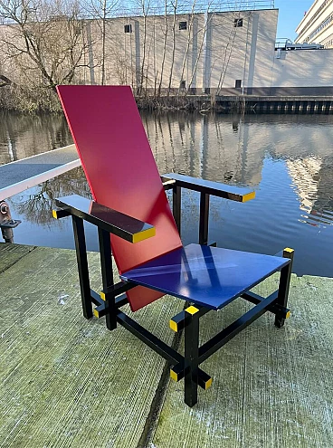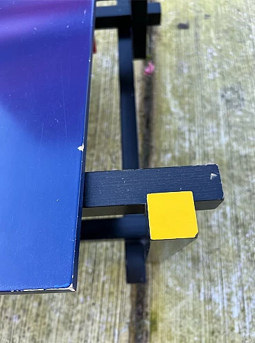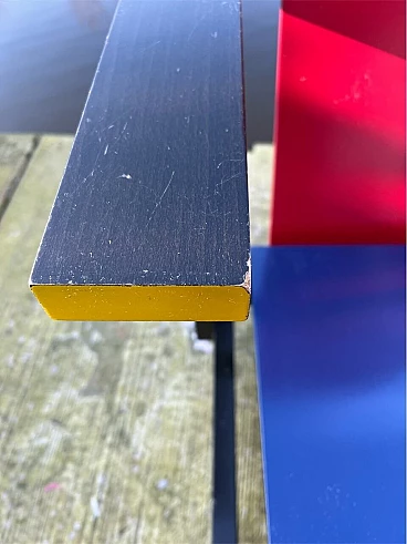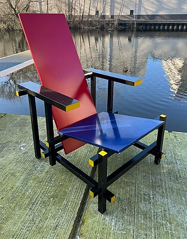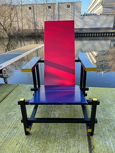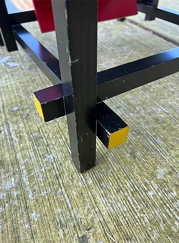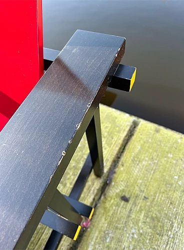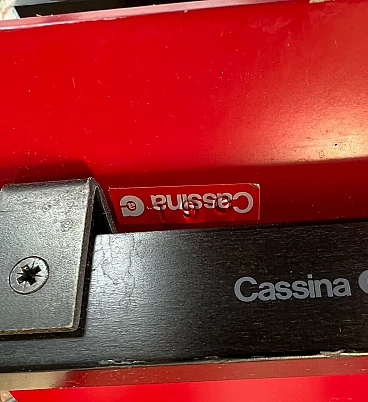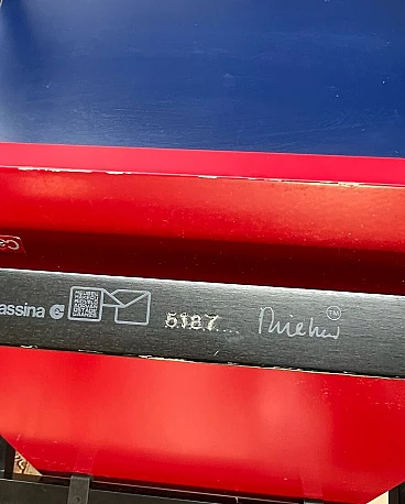 Bellissima e iconica poltrona in legno Rossa e Blu 635 di Cassina (modello risalente al 1980), disegnata da Gerrit T. Rietveld nel 1923. Questa famosa sedia, icona di stile, è presente nei più importanti musei di arte contemporanea di tutto il mondo, quindi può essere considerata una vera e propria opera d'arte. La poltrona, proveniente da una collezione privata, ha 43 anni ed è stata utilizzata come poltrona, come dimostrano le sue condizioni, che sono buone. Presenta segni di normale utilizzo nelle parti angolari delle superfici, come da foto e alcune parti verniciate consumate. La struttura è stabile e sicura, per il resto è ok. Occasione unica per appassionati e collezionisti d'arte contemporanea. La poltrona ha l'etichetta Cassina sul retro e dal numero di serie (5187).