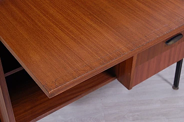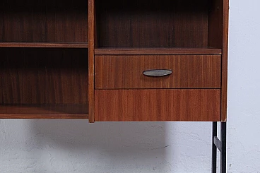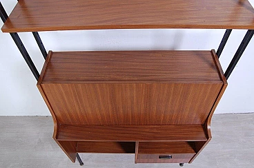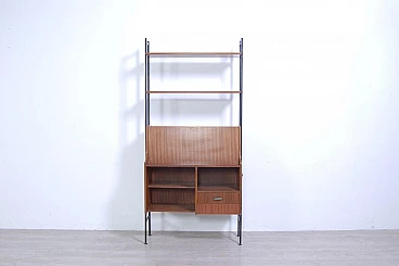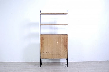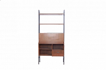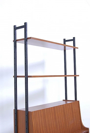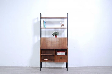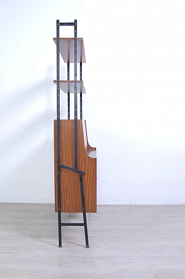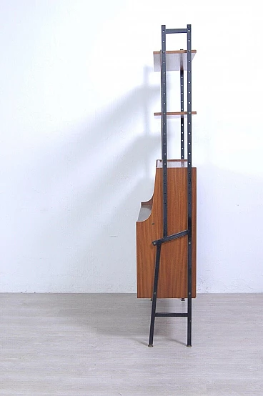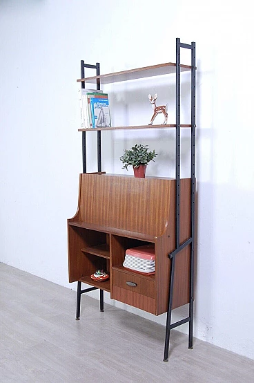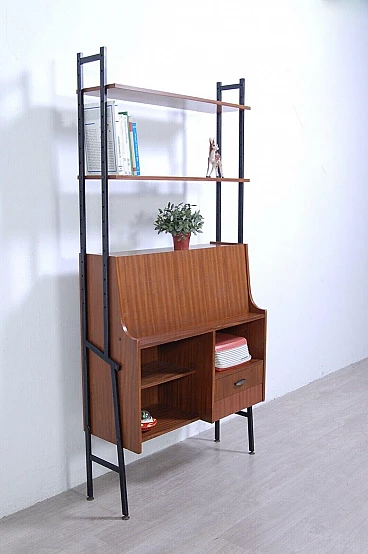 Libreria in legno e ferro, anni '50. Ai montanti in ferro sono fissati due mensole (posizione regolabile nella parte superiore) e un mobiletto a ribalta con cassetto e scomparti a giorno; quest'ultimo va posizionato nella parte inferiore per garantire stabilità alla struttura.
