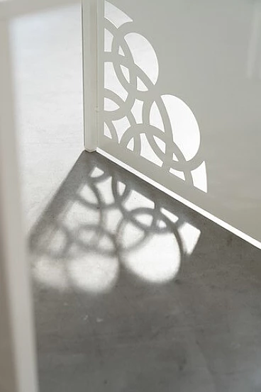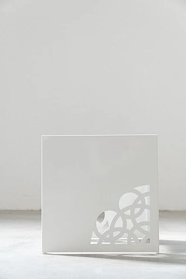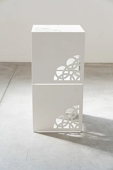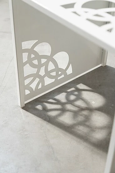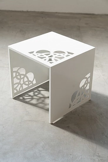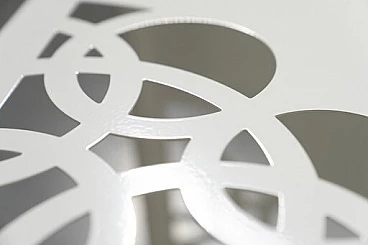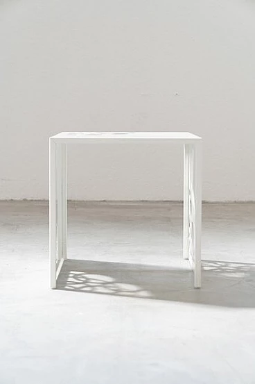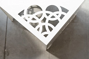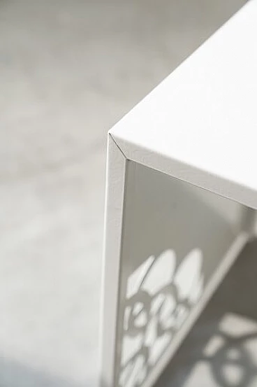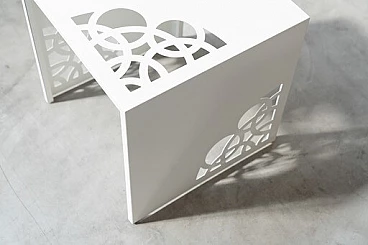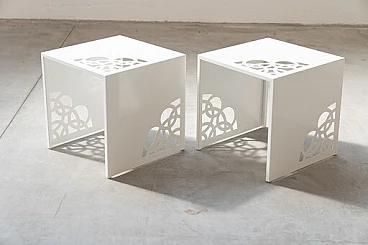Coppia di tavolini in ferro laccato bianco con incisioni a laser