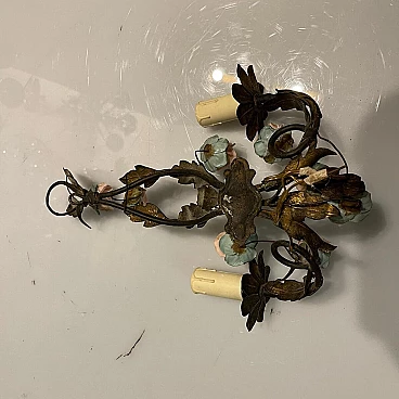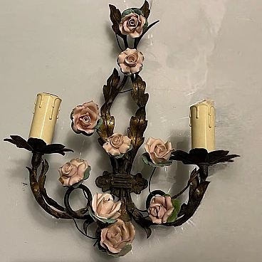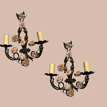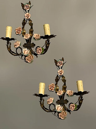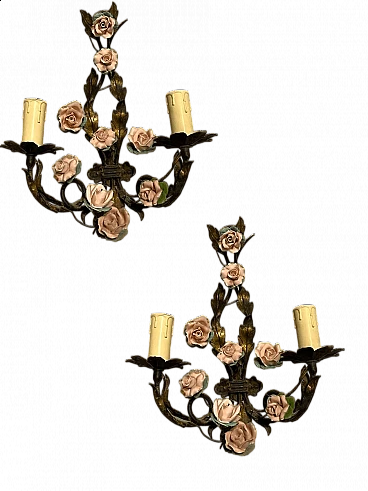 Coppia di applique con rose in tôle e porcellana, anni '60
