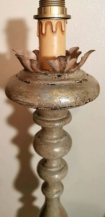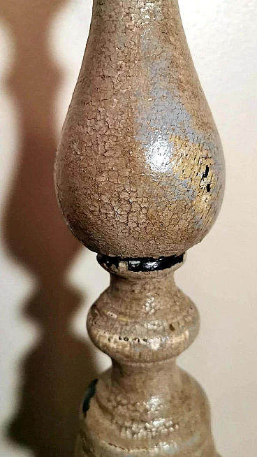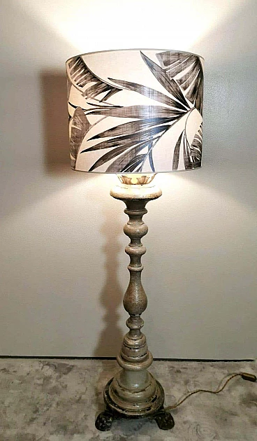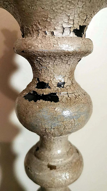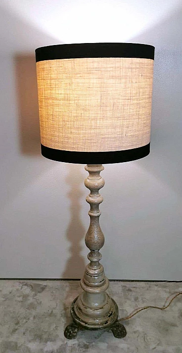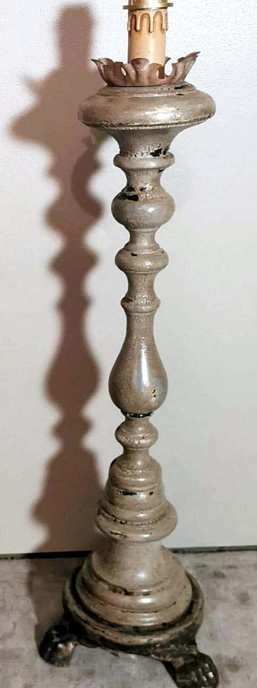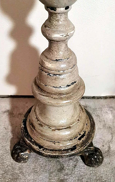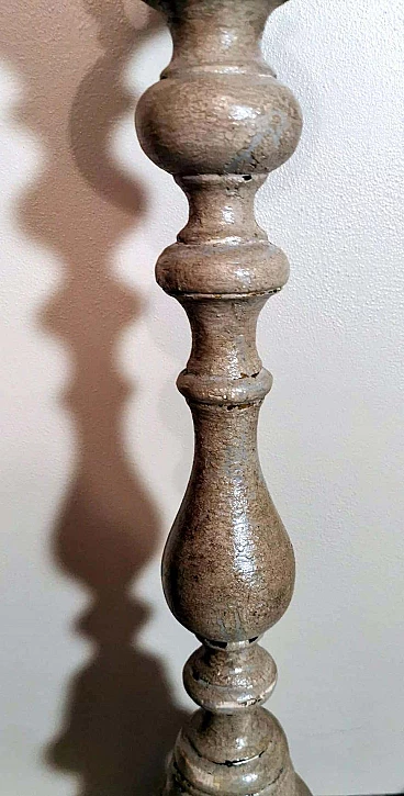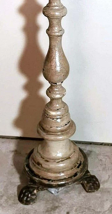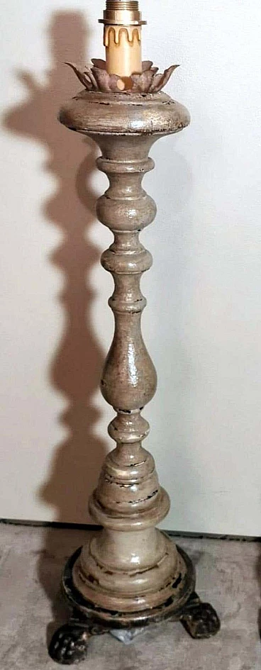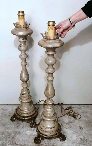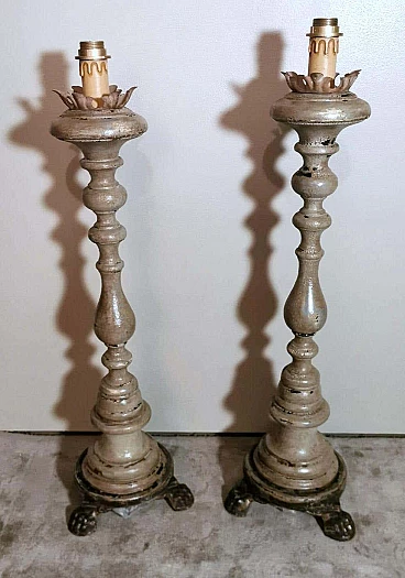 Particolare, rara e antica coppia di candelieri da altare italiani a forma di torcia, realizzati completamente con la tecnica della tornitura manuale, un particolare modo di lavorare che permette agli oggetti di avere una forma arrotondata: il pezzo di legno ruota con l'ausilio del tornio, mentre l'artigiano utilizza speciali strumenti chiamati "sgorbie" per modellarne e decorarne la superficie. Sono stati poi dipinti con una vernice pastosa grigio-bianca, che nel tempo ha assunto l'effetto craquelure. Sulla struttura lignea non abbiamo quindi ritenuto di fare alcun restauro perché la sua patina velata e le sue imperfezioni la rendono davvero seducente e affascinante e ne attestano l'antichità e l'autenticità. Alla sommità di ognuna è presente una "bobeche" metallica di foglie sagomate fatta per contenere grandi candele; quando, in tempi più recenti, sono state elettrificate, è stato applicato un portalampada a forma di candela; la base è costituita da tre zampe di leone in bronzo fuso. Sono stati prodotti in un laboratorio artigianale della provincia di Lucca (Toscana, Italia) tra il 1830 e il 1835; la zona era famosa per la produzione di arredi liturgici di ogni genere. Il maestro artigiano si ispirò agli antichi candelieri a fiaccola medievali presenti nelle cattedrali dell'antichità e creò i nostri senza stravolgere intenzionalmente il disegno originale. Il candeliere a fiaccola è un arredo liturgico presente in ogni chiesa, un tempo collocato a terra e solo successivamente sull'altare; il suo utilizzo risale alle origini stesse della chiesa, ed è chiaramente e indissolubilmente legato al simbolismo della luce come espressione della fede, della speranza e della resurrezione di Cristo. Al di là dell'ambiente in cui veniva collocato, il candeliere ha sempre avuto un ruolo importante nella vita delle persone, in quanto rappresentava l'elemento protettivo dalle tenebre e dall'oscurità. I nostri candelieri sono stati creati con altezze diverse (forse a seconda del luogo in cui dovevano essere collocati), il più alto è di 99 cm e l'altro è di 96 cm entrambi con un diametro massimo di 28 cm. I candelieri sono nelle loro condizioni originali, proprio per questa particolarità sono un pezzo unico di arredamento di rara bellezza. Su richiesta, possono essere dotati di un paralume moderno o di uno classico non incluso nel prezzo (vedi foto). L'impianto elettrico è funzionante ma il cablaggio è europeo, la compatibilità di tensione in altri stati va sempre verificata da un elettricista prima dell'uso. Misure diametro 28 cm, altezza 99 cm. Per tutte le nostre spedizioni utilizziamo materiali di imballaggio speciali (casse di legno su misura, polistirolo, ecc.) per la massima protezione e sicurezza degli oggetti.