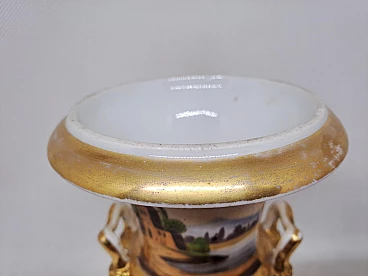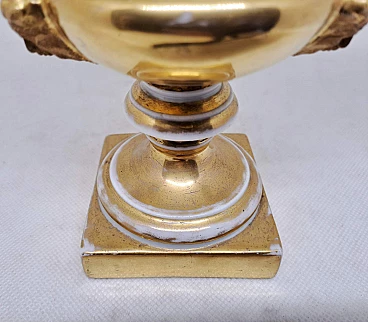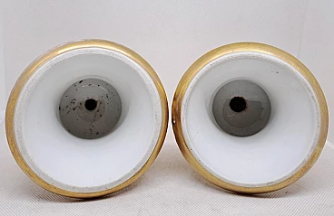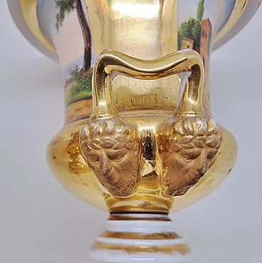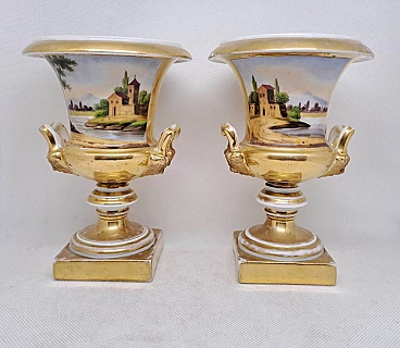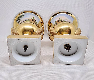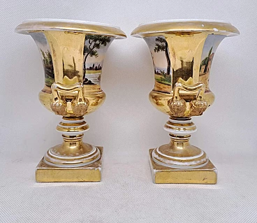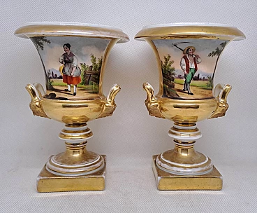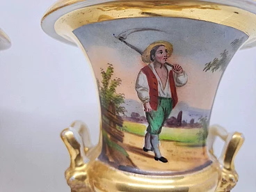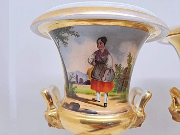 Coppia di vasi Impero in ceramica dorata con scene agresti, prima metà dell'800